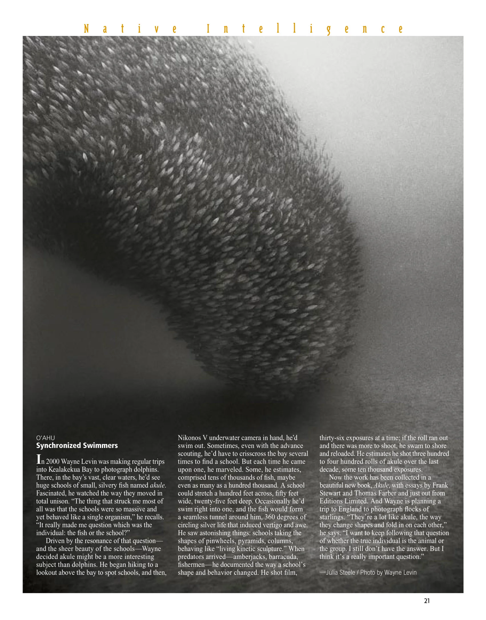 In 2000 Wayne Levin was making regular trips into Kealakekua Bay to photograph dolphins. There, in the bay’s vast, clear waters, he’d see huge schools of small, silvery fish named akule. Fascinated, he watched the way they moved in total unison. “The thing that struck me most of all was that the schools were so massive and yet behaved like a single organism,” he recalls. “It really made me question which was the individual: the fish or the school?”